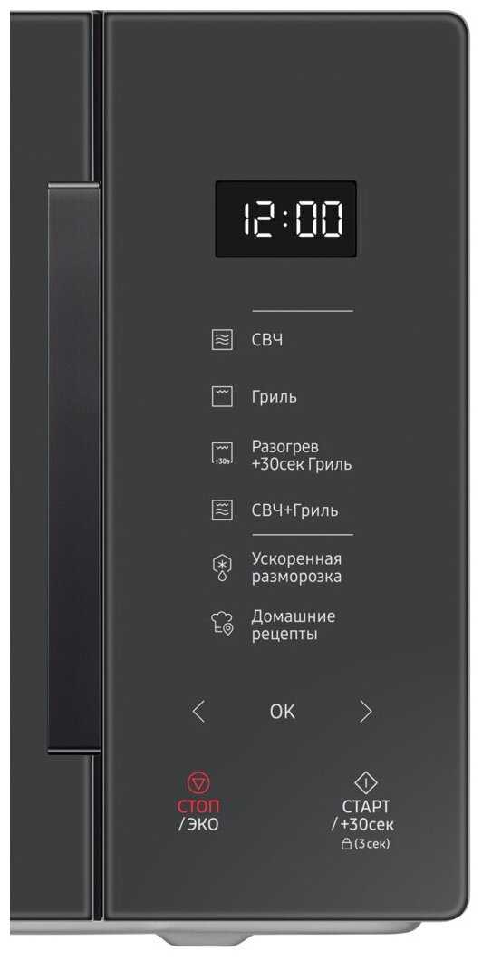 Удобство эксплуатации и управление Автоматические программы (30 рецептов) для десертов, мяса и выпечки получили высокие оценки: брауни, бисквиты и банановый хлеб готовятся равномерно. Функция устранения запахов за 5 минут эффективно очищает камеру. При этом интерфейс имеет существенный минус: для запуска 30-секундного разогрева требуется двойное нажатие (кнопка СВЧ + время), тогда как в других моделях Samsung хватало одной кнопки. Громкость звуковых сигналов (завершение цикла, нажатие клавиш) критикуется за избыточную громкость, хотя их можно полностью отключить комбинацией стрелок после перезагрузки устройства.