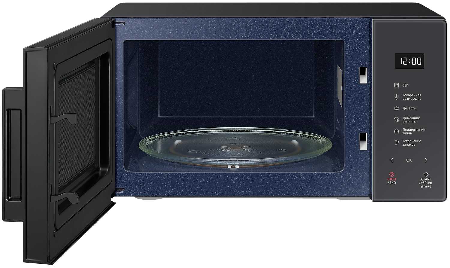 Камера с биокерамическим покрытием выдерживает посуду диаметром до 27 см и высотой до 16 см. Пользователи подтверждают безопасность работы с фарфором и толстостенной керамикой – посуда не раскаляется, а тепло распределяется равномерно благодаря трехконтурной системе СВЧ-излучения. -