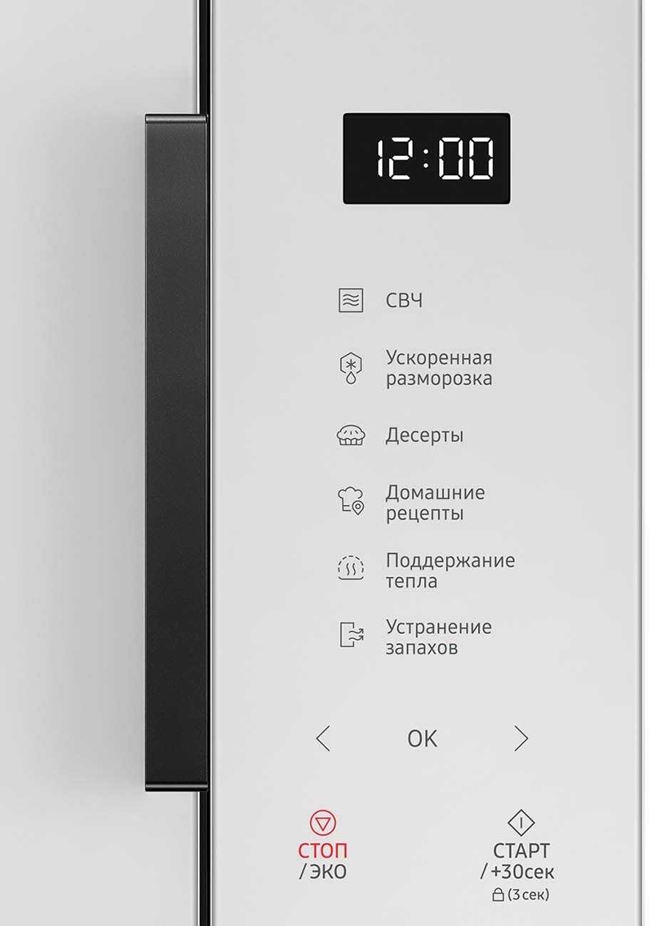 Сенсорное управление с высокой чувствительностью реагирует на легкие касания, но интерфейс требует привыкания - отсутствие кнопки быстрого старта (необходимость сначала выбирать режим СВЧ) критикуется частью пользователей. Дверца с эргономичной ручкой открывается плавно, хотя в отдельных экземплярах наблюдается люфт. Важная особенность - возможность полного отключения звуковых сигналов (через комбинацию кнопок ← и → при зажатии), что ценно для ночного использования или семей с детьми. Подсветка камеры автоматически отключается при длительном открытии дверцы для экономии энергии. Мощность регулируется с шагом 100 Вт в диапазоне 100-800 Вт, позволяя точно настраивать процессы разогрева.