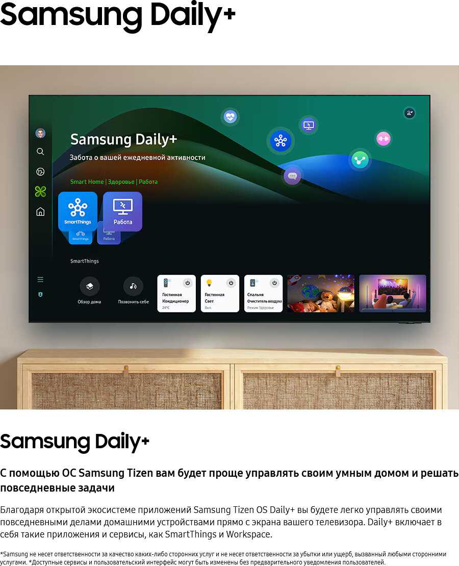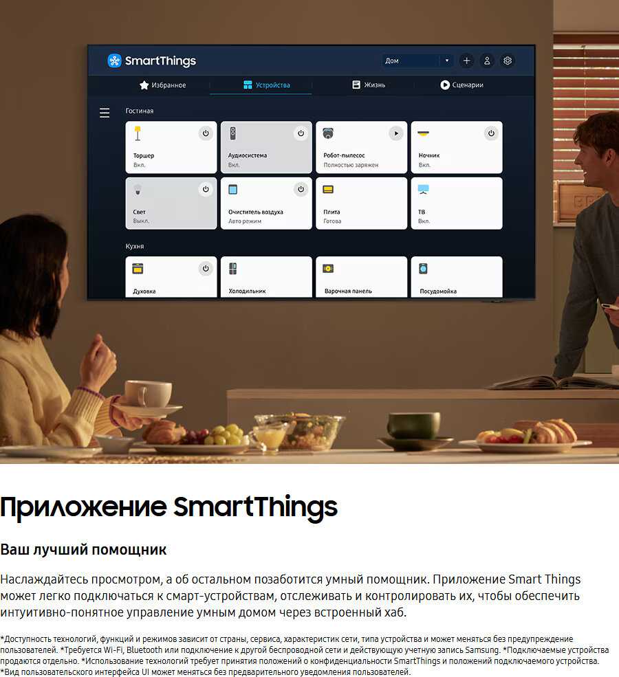 - Поддержка SmartThings обеспечивает интеграцию с умным домом (управление светом, кондиционером) без использования смартфона.