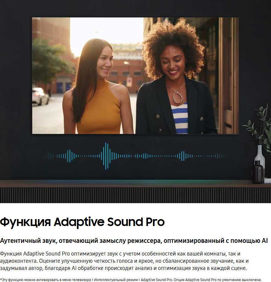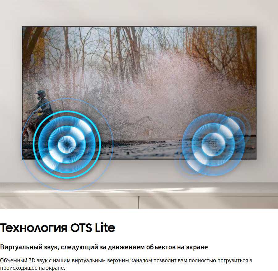 Штатные динамики выдают "плоский" звук с акцентом на высокие частоты и минимальными басами — для музыки или фильмов с саундтреками требуется саундбар. Громкости достаточно для комнат до 20 м², но на уровне 30-40% появляется дребезжание пластика корпуса. Технологии Dolby Digital частично компенсируют недостатки, однако баланс частот хуже, чем в TV Samsung 2016-2018 годов.