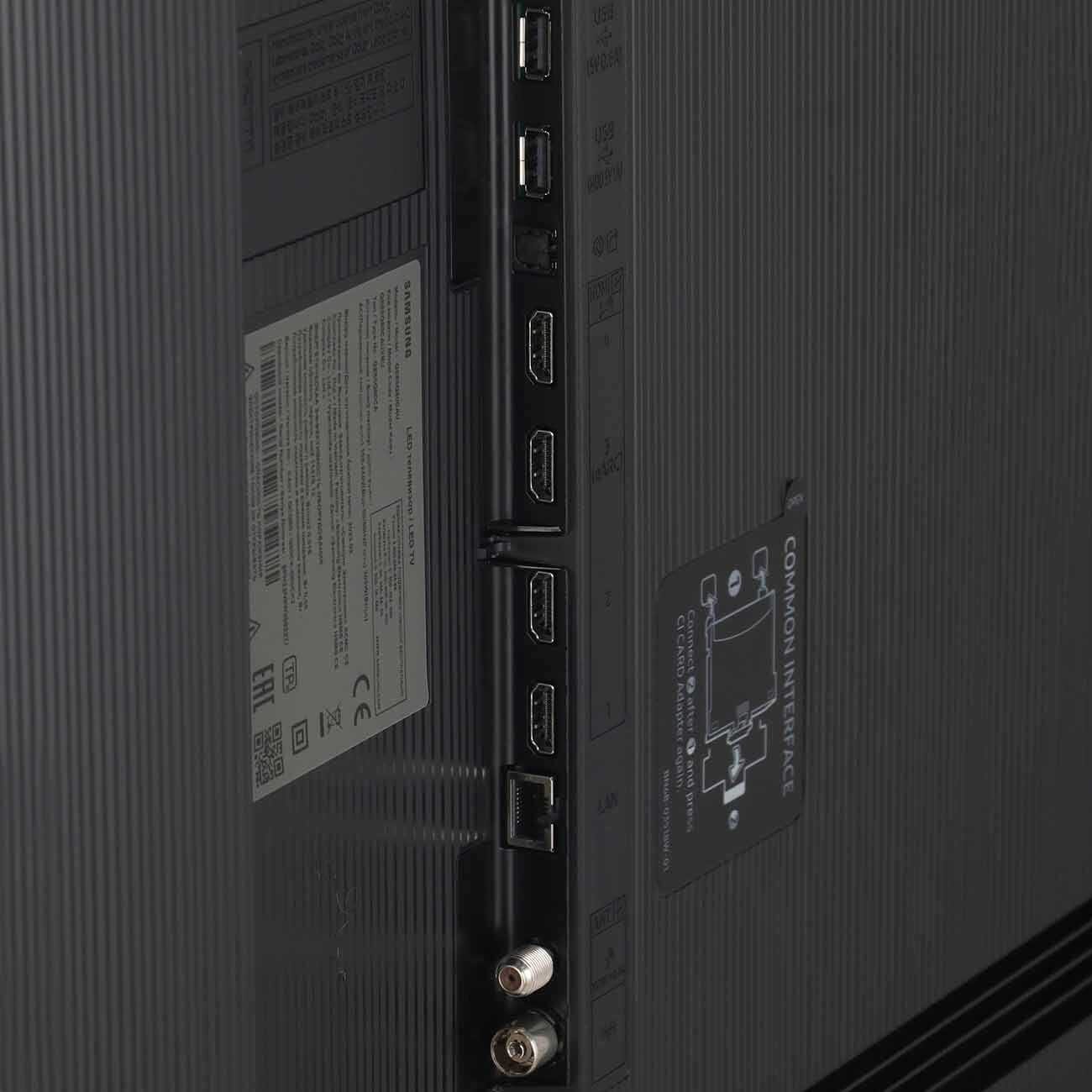 Все разъемы (HDMI, USB, оптический выход) вынесены в отдельный блок, соединяемый с телевизором тонким прозрачным кабелем. Это позволяет монтировать экран вплотную к стене. Пользователи ценят удобство подключения периферии без необходимости добираться к тыльной панели телевизора. -