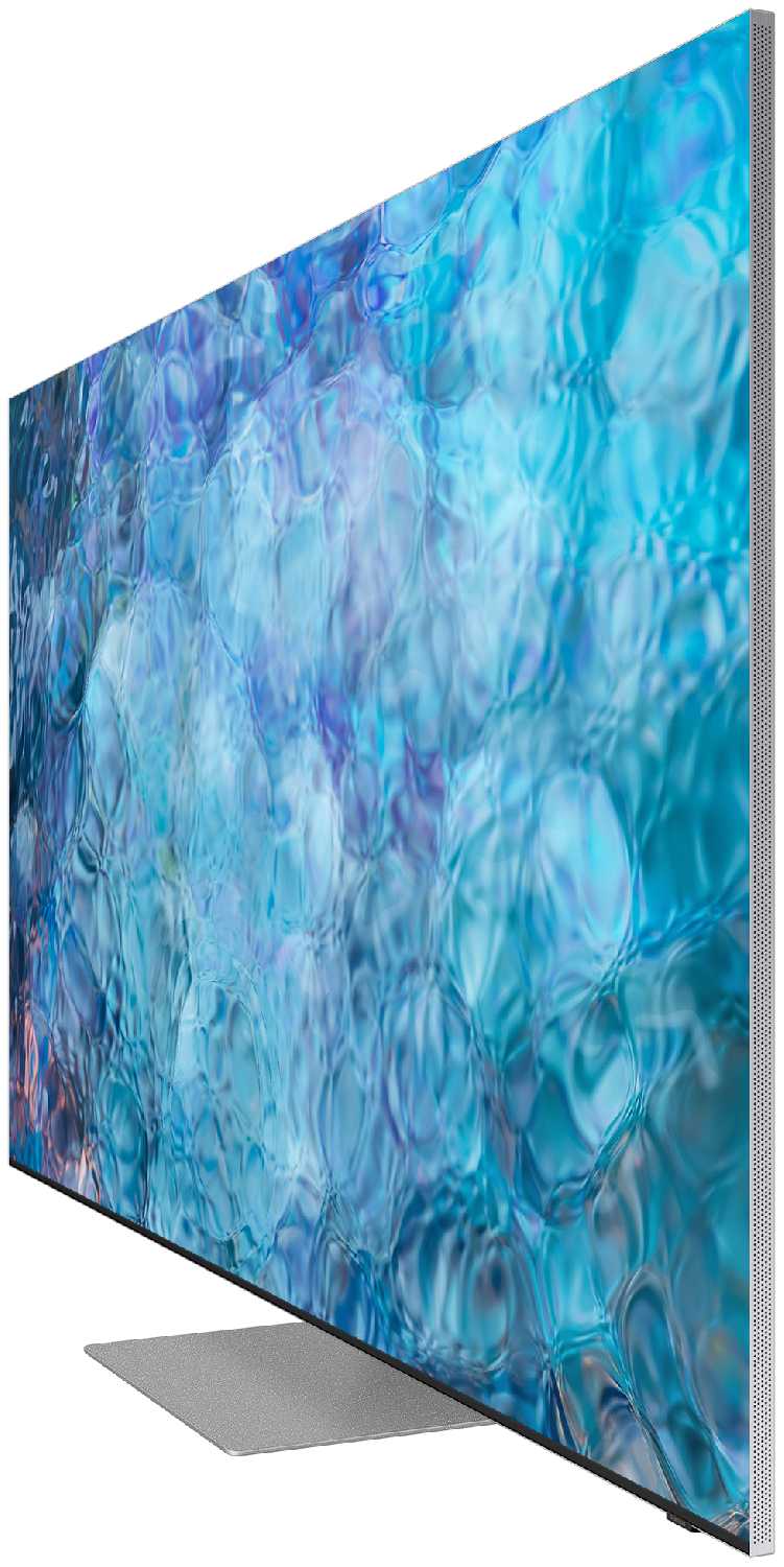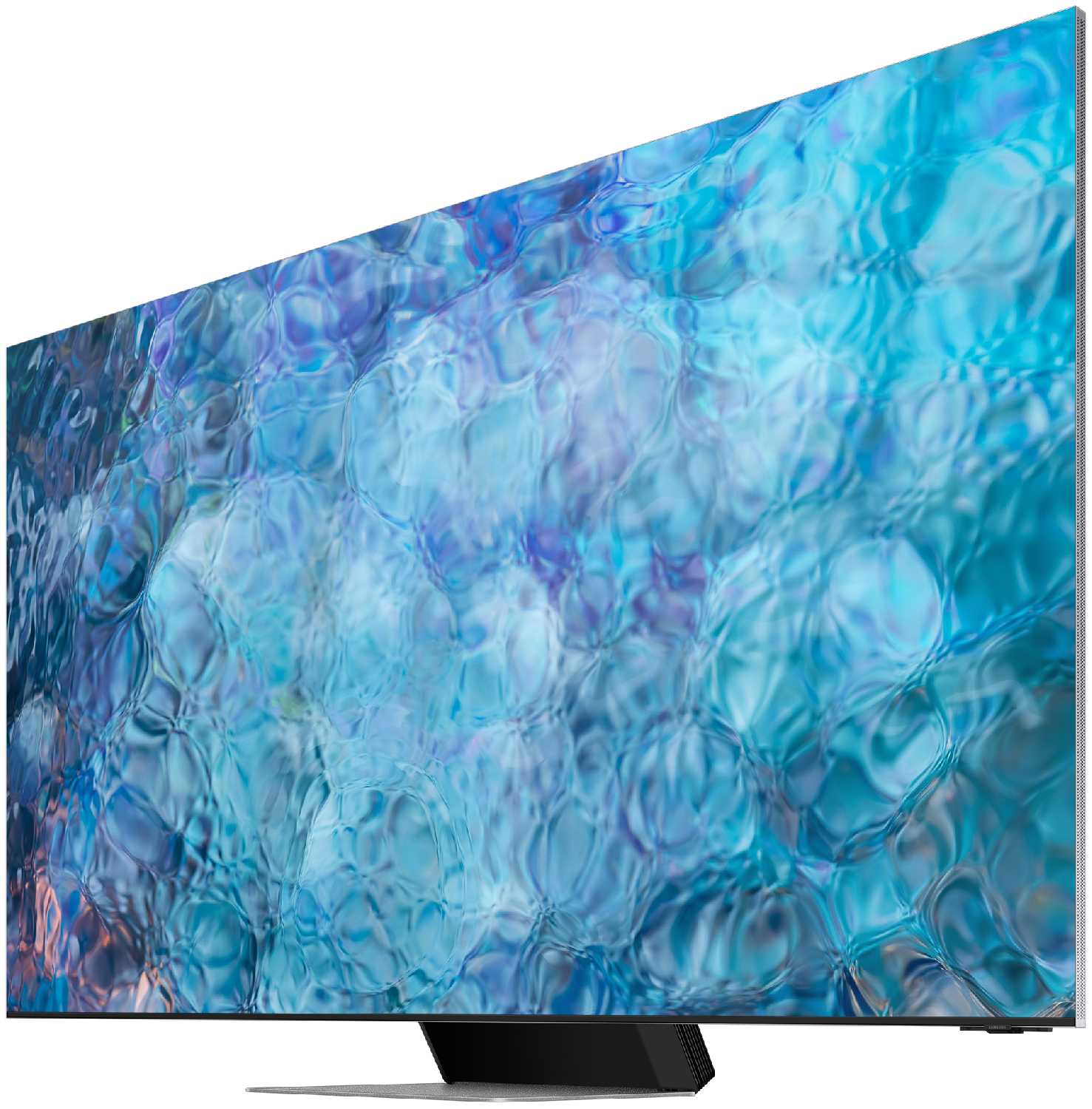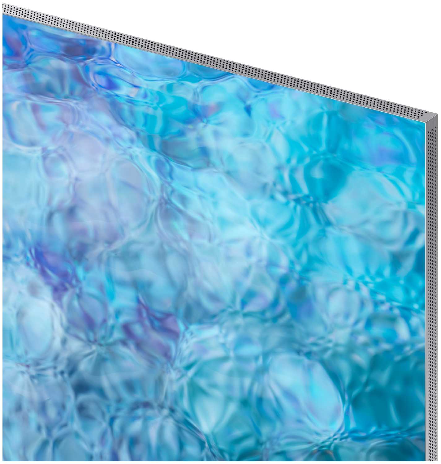 - Безрамочный экран (7680x4320 пикселей) и минимальная толщина позволяют телевизору сливаться со стеной, создавая футуристический вид.