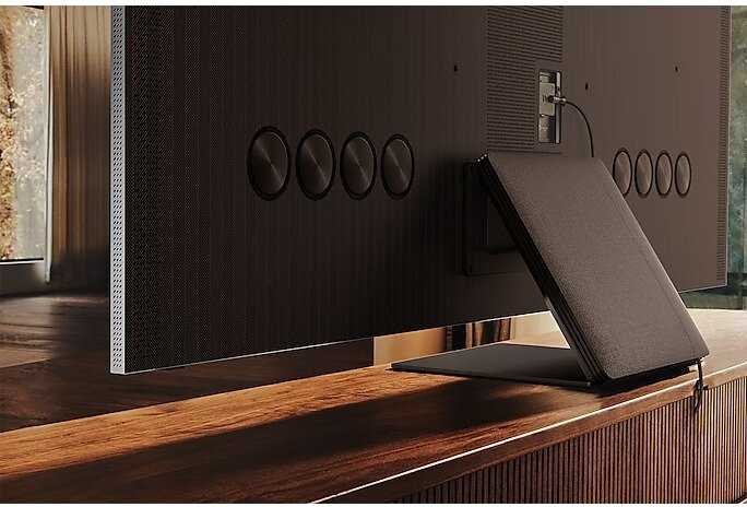 Телевизор имеет 4 динамика и 4 сабвуфера, расположенные сзади телевизора. Редко громко слушаю телевизор, да и играю в специальной гарнитуре, но звук меня очень порадовал. После приобретения саундбара с активным сабом, звук стало насыщенным)