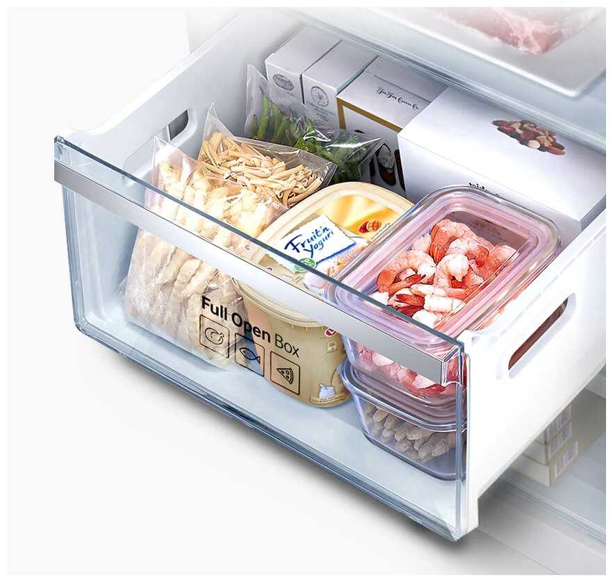 - Выдвижные ящики морозильной камеры оснащены роликовым механизмом, который не цепляется за уплотнитель даже при неполном открытии двери на 90°.