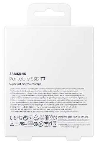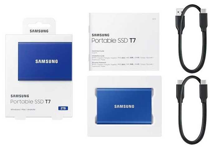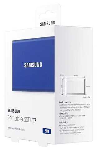 Комплектация : | портативный SSD-накопитель Samsung T7, кабель USB Type C-> C, переходник Type C->-A, краткое руководство по эксплуатации, гарантийный талон |