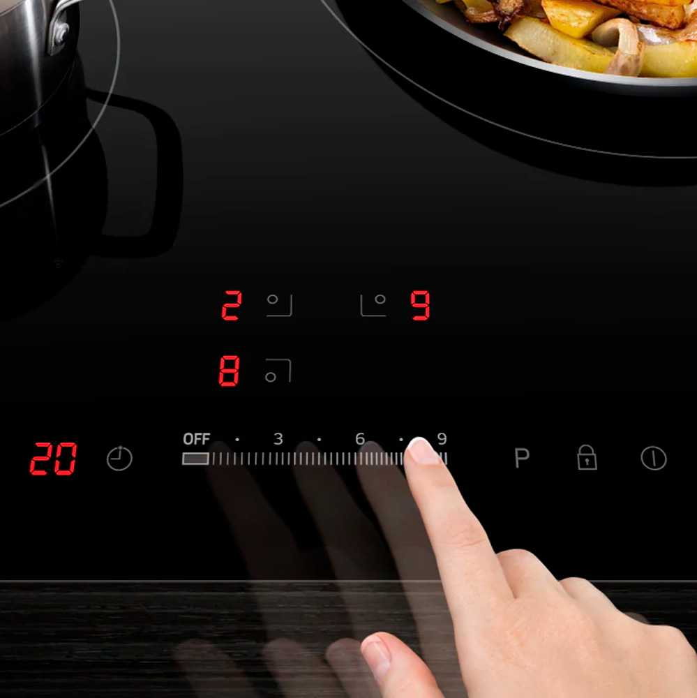 Слайдерное управление — ключевое преимущество модели. Пользователи отмечают интуитивность и скорость регулировки мощности: для изменения уровня нагрева достаточно провести пальцем по шкале. Особенно удобно быстрое отключение конфорок — двойное нажатие вместо десятикратного набора кнопок. Таймеры на каждую конфорку (4 отключающих и 1 сигнальный) позволяют автоматизировать готовку, например, последовательно варить овощи без постоянного контроля. Однако интерфейс требует привыкания: выбор конфорки и регулировка мощности совмещены на одной сенсорной панели, что иногда приводит к случайным нажатиям. Блокировка от детей работает надёжно, но активация занимает несколько секунд. Отсутствие отдельной кнопки экстренного отключения всех зон — минус для некоторых сценариев.