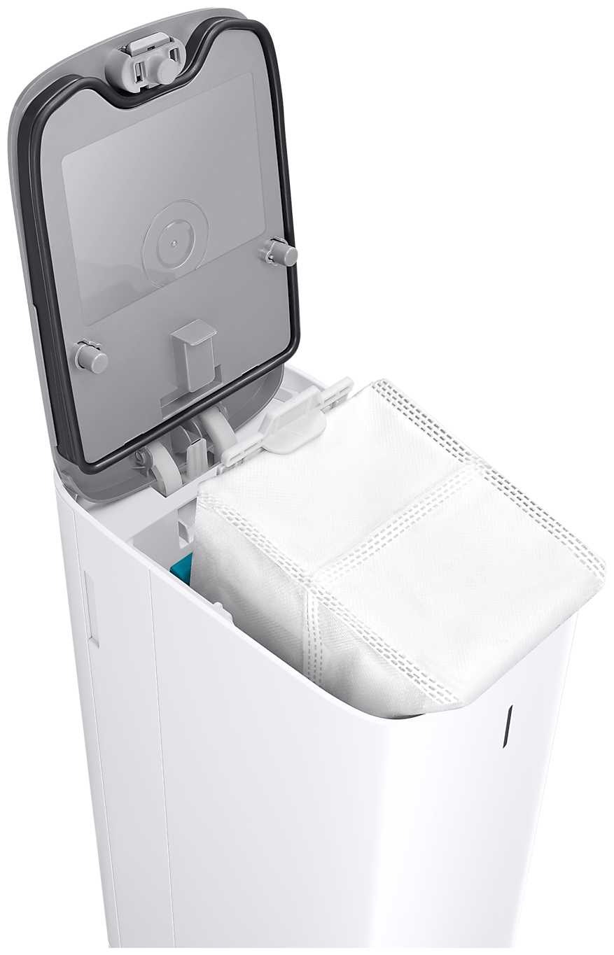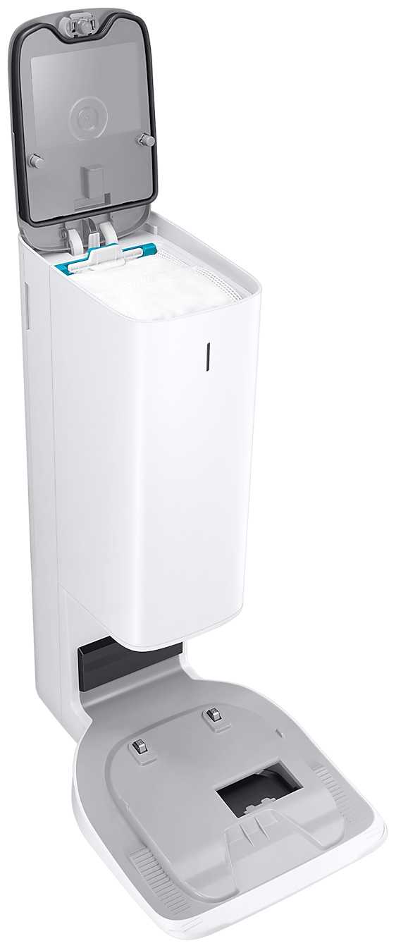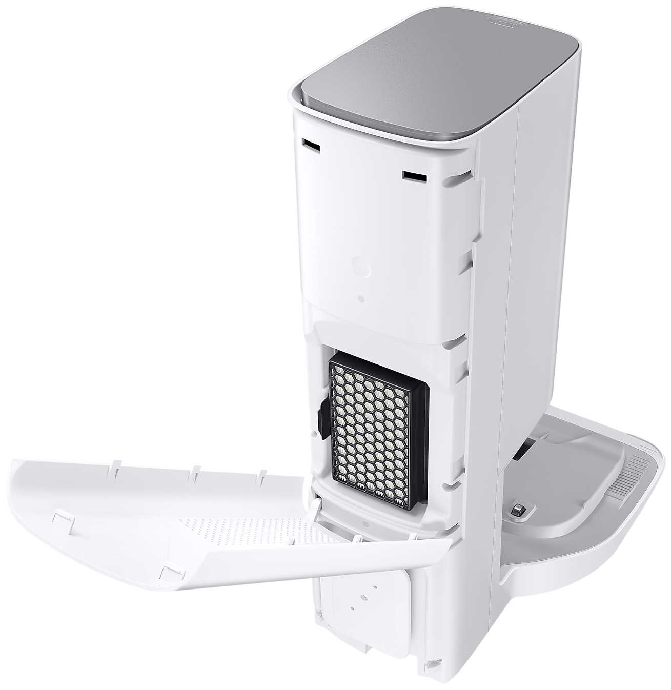 - Система вакуумной выгрузки мусора с мощностью всасывания 30 Вт полностью опустошает пылесборник за 10-15 секунд, минимизируя контакт с аллергенами.