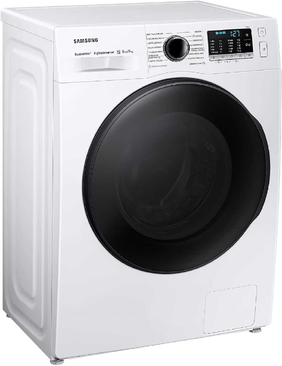 - + Купил данную стиральную машину, зная высокое качество и многолетний опыт использования аналогичных стиральных машин производства Samsung. Хорошая, относительно недорогая, стиральная машина с сушкой. Довольно устойчивая не скользит даже на плиточном полу. 14 программ, с модификаторами режима (интенсивная стирка, предварительное замачивание). Можно изменить количество циклов полоскания, температуру и скорость вращения барабана при отжиме. Есть сушка и отложенный старт. Имеется автоматическое взвешивание заложенного белья, что уточняет время работы программы. Хороший отжим (до 1400 об/мин). При отжиме перед раскручиванием на больших оборотах пытается устранить дисбаланс загруженного белья, путём остановки и перемешивпния белья сменой направления вращения барабана. Но при большом дисбалансе (простыни с пододеяльниками плюс тяжелые махровые полотенца) полностью устранить дисбаланс не удастся, используется меньшая скорость вращения. Есть режим отпаривания, при котором можно стерилизовать белье, однако нет разделения на стерилизацию и проветривание (освежение), как в некоторых других аналогичных машинах Samsung с сушкой.