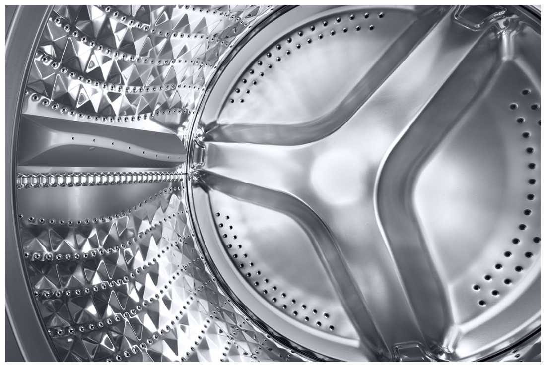 Рифленый барабан Diamond Drum предотвращает зацепки и растяжение трикотажа, а специальные направляющие плавно переворачивают вещи. В режиме "Шерсть/Ручная стирка" барабан имитирует бережные движения руками, сохраняя структуру волокон. Пользователи стирают даже кашемировые свитера без риска усадки или катышков. -
