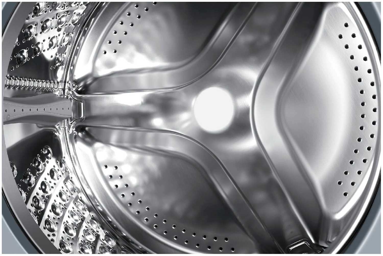 - Инверторный двигатель обеспечивает плавное вращение барабана, минимизируя вибрации в стандартных режимах.