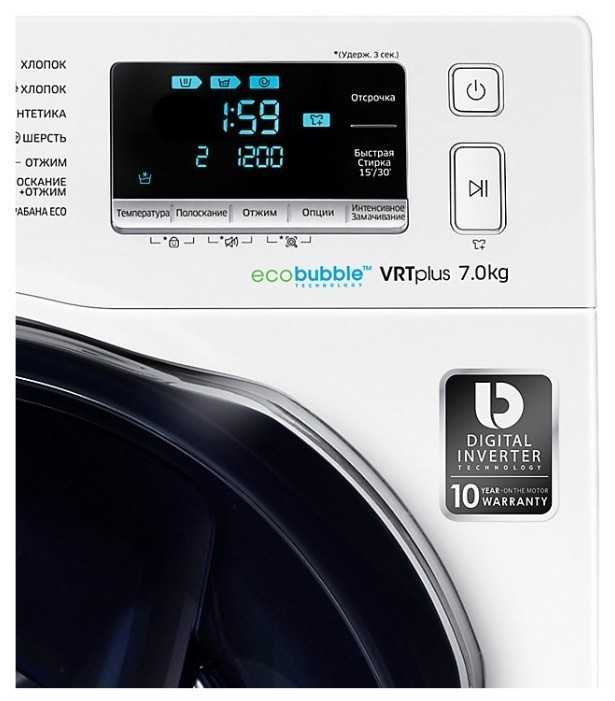 - + Вместительность Технология Eco bubble Сушка Качество работы Дополнительный отсек для вброса одежды