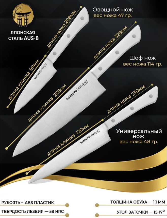 | Состав набора ножей : | нож для овощей, универсальный нож, шеф-нож |