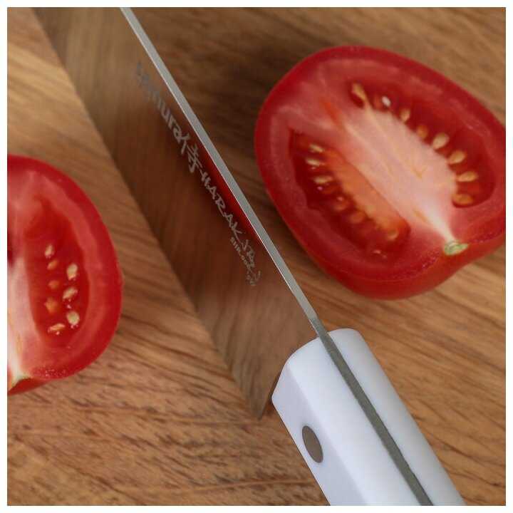 Особенности конструкции и эргономики Легкость (средний вес 180 г) и ультратонкое лезвие (1.5-2 мм) — ключевые особенности, вызывающие полярные оценки. С одной стороны, это обеспечивает маневренность и снижает усталость руки при длительной нарезке. С другой — гибкость клинка воспринимается как "хлипкость": при давлении на жесткие продукты или случайном контакте с посудой лезвие деформируется. Рукоять из белого пластика (у отдельных моделей) не впитывает запахи, но ее толщина подходит не для всех — владельцы крупных ладоней отмечают дискомфорт. Опасность представляет острая пятка у основания клинка: многочисленные порезы происходят именно при неосторожном хвате.