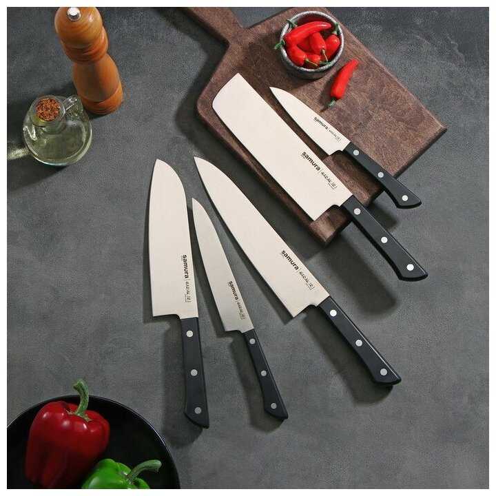 Есть пара недорогих ножей этой марки. Есть ножи других марок, в разы дороже, но в 80% случаев использую Самуру( допустим для разделки мяса или замороженных продуктов эти не подходят). Основной плюс ножей, это их малая толщина(но при этом большая прочность), позволяющая нарезать очень тонкие и аккуратные ломтики. На фото ещё один бюджетный этой марки, серия "гольф", у него на мой взгляд неудобная ручка(сухая нормально, но чуть сырая уже некомфортно), но зато лезвие после галтовки(ну это на любителя). У серии "наракири" к ручке претензий нет, достаточно удобная. Ну наверное чудес ждать не стоит, ножи острые, но затупятся достаточно быстро. Возможно на это влияет "японская заточка" с малым углом, не знаю. В любом случае любой нож нужно периодически править мусатом(желательно керамическим, на фото металлический, керамический сломал недавно), ну и чтобы не заморачиваться с более качественной ручной заточкой и выдерживанием угла, могу посоветовать недорогую электрическую точилку оптимизированную для японских ножей(на фото производитель виден). Для поддержания домашних ножей в рабочем состоянии этих аксессуаров будет заглаза.