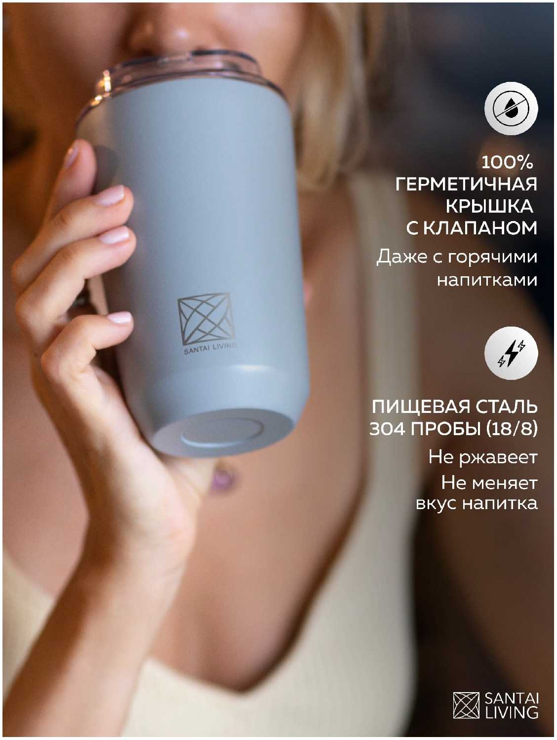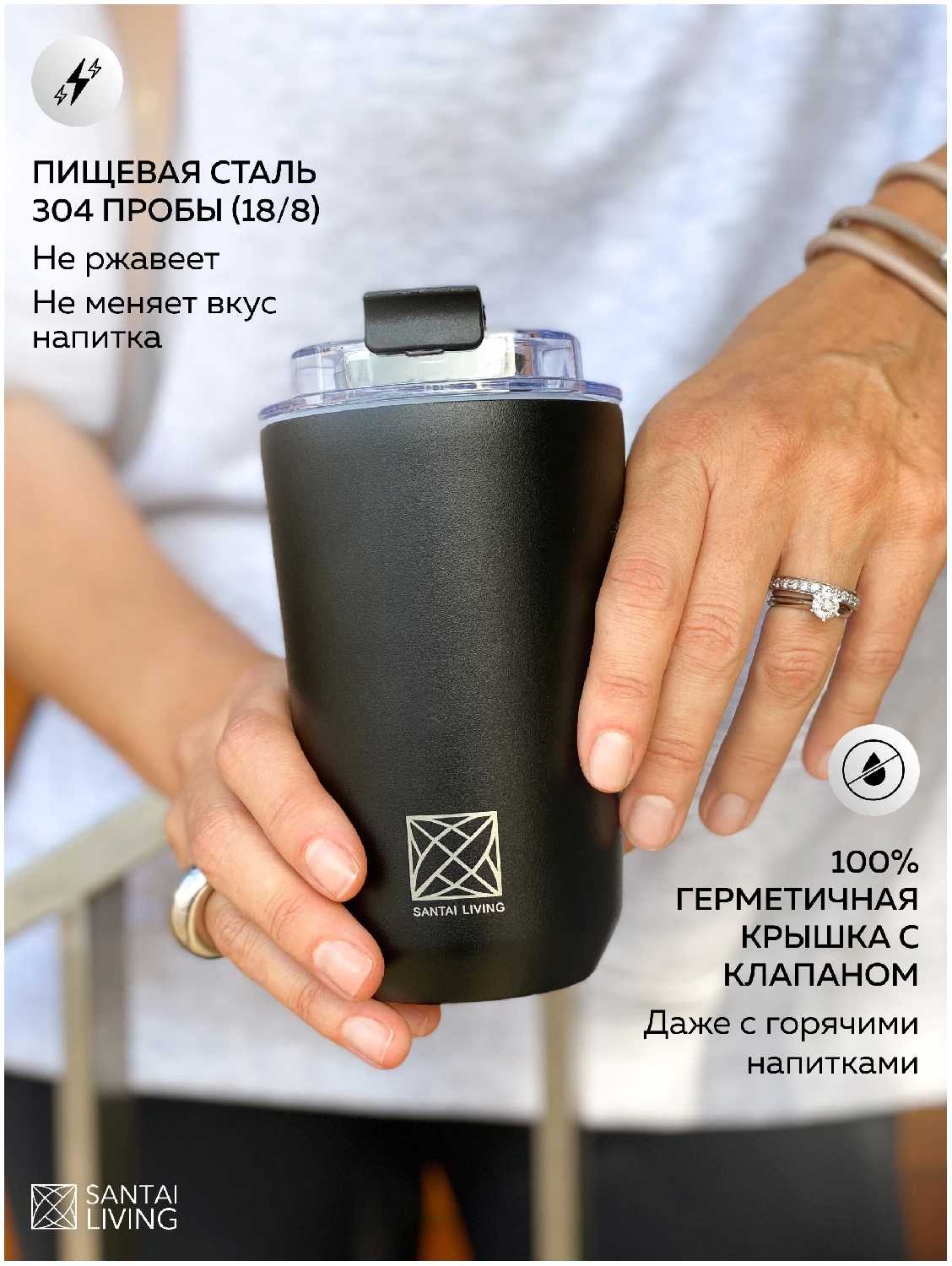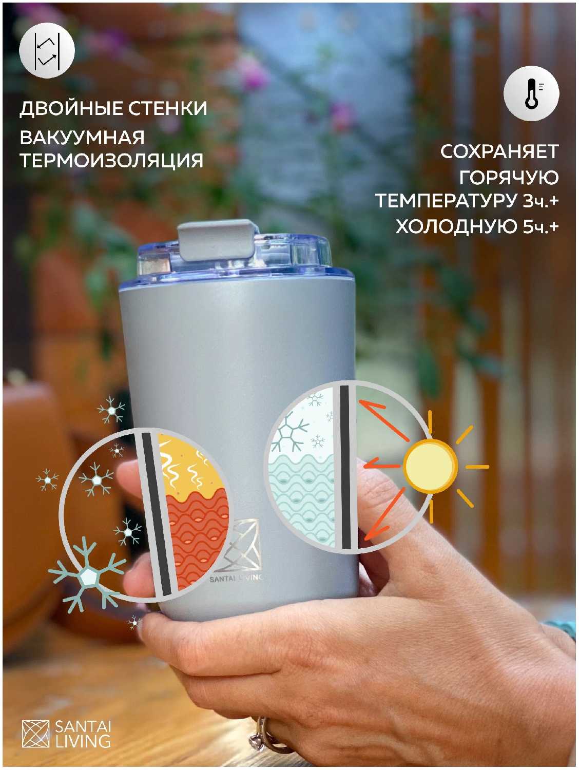 - Кружка сохраняет напиток горячим до 5 часов (по отзывам) благодаря двойным стенкам из нержавеющей стали.