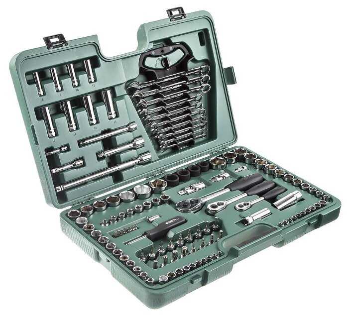 Набор из 120 предметов, все упаковали в кейс плотный хороший, ничто не вываливается, все на своих местах. В наборе трещотка, ключи гаечные вороток, пользовался всем, ничего в работе меня не подвело, все работает прекрасно, не скользит, по качеству и прочности...