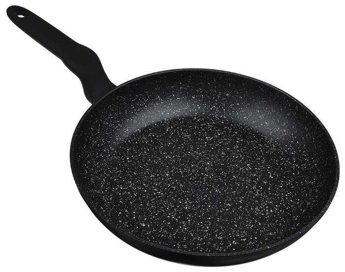 - + Хорошее антипригарное покрытие. В виде камня. 28см, это хороший размер. Ничего не пригорает. Ручка с углублением под большой палец. Относительно толстый металл (алюминий).