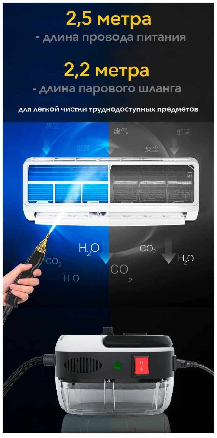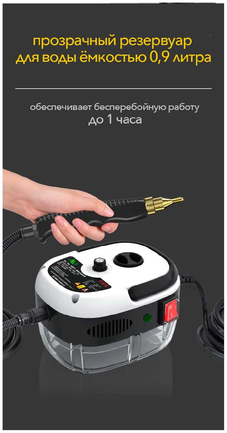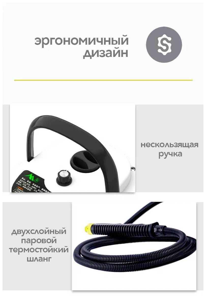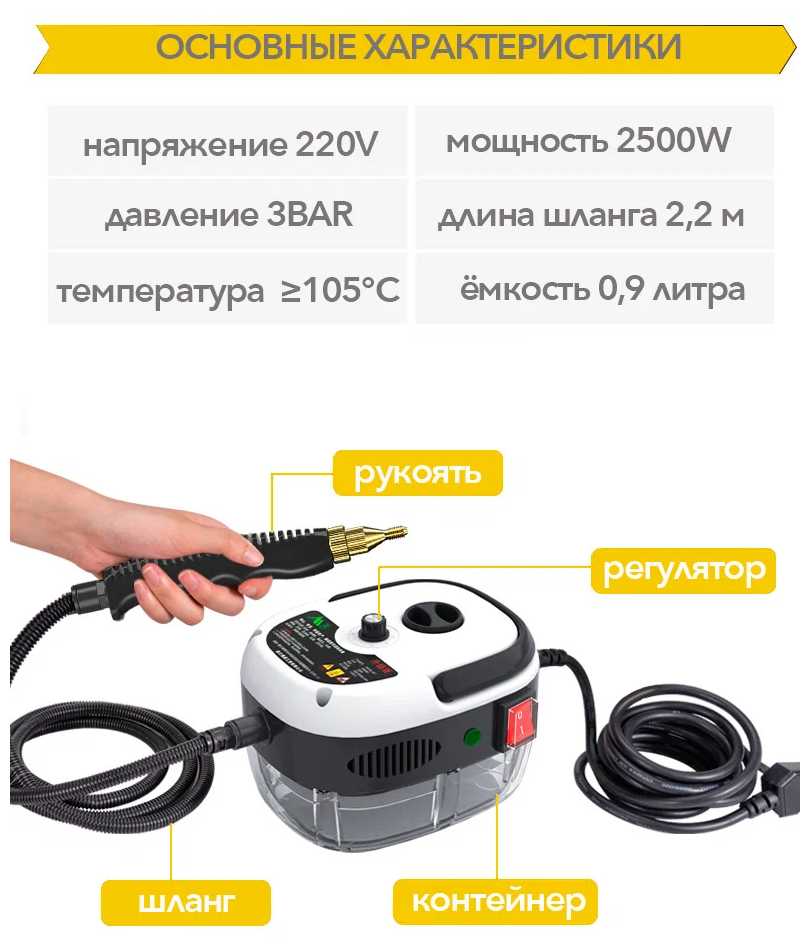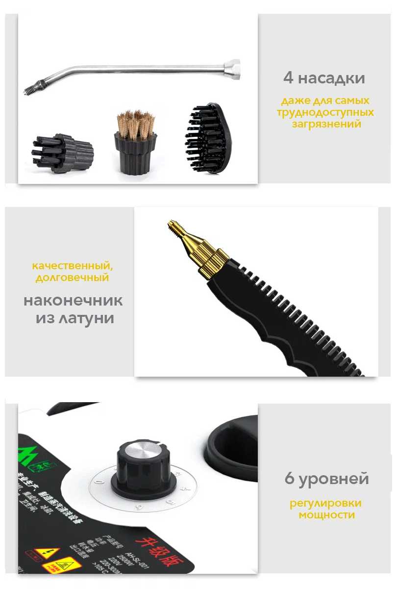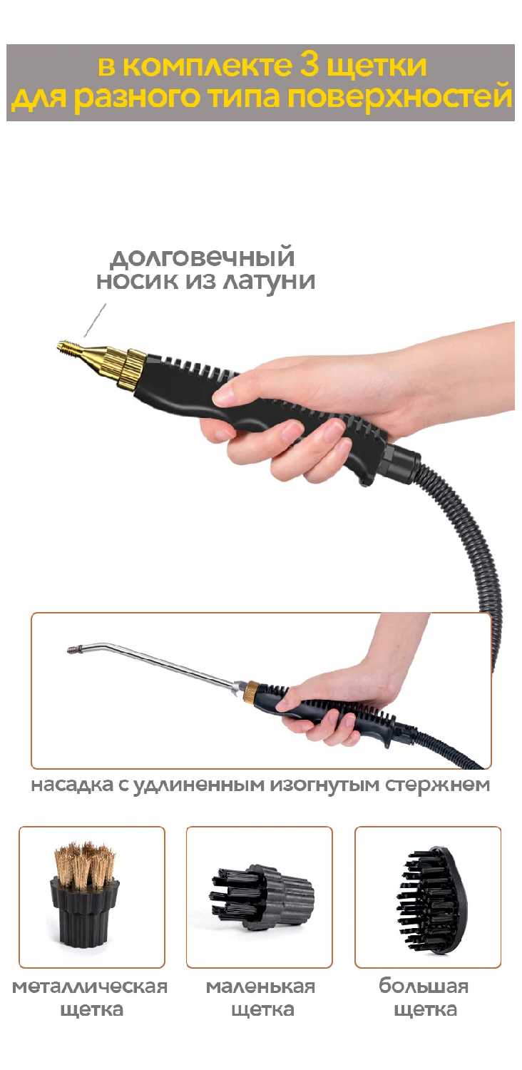 - + Довольно мощная струя пара, удобный, длинный шланг и металлический носик, несколько насадок.