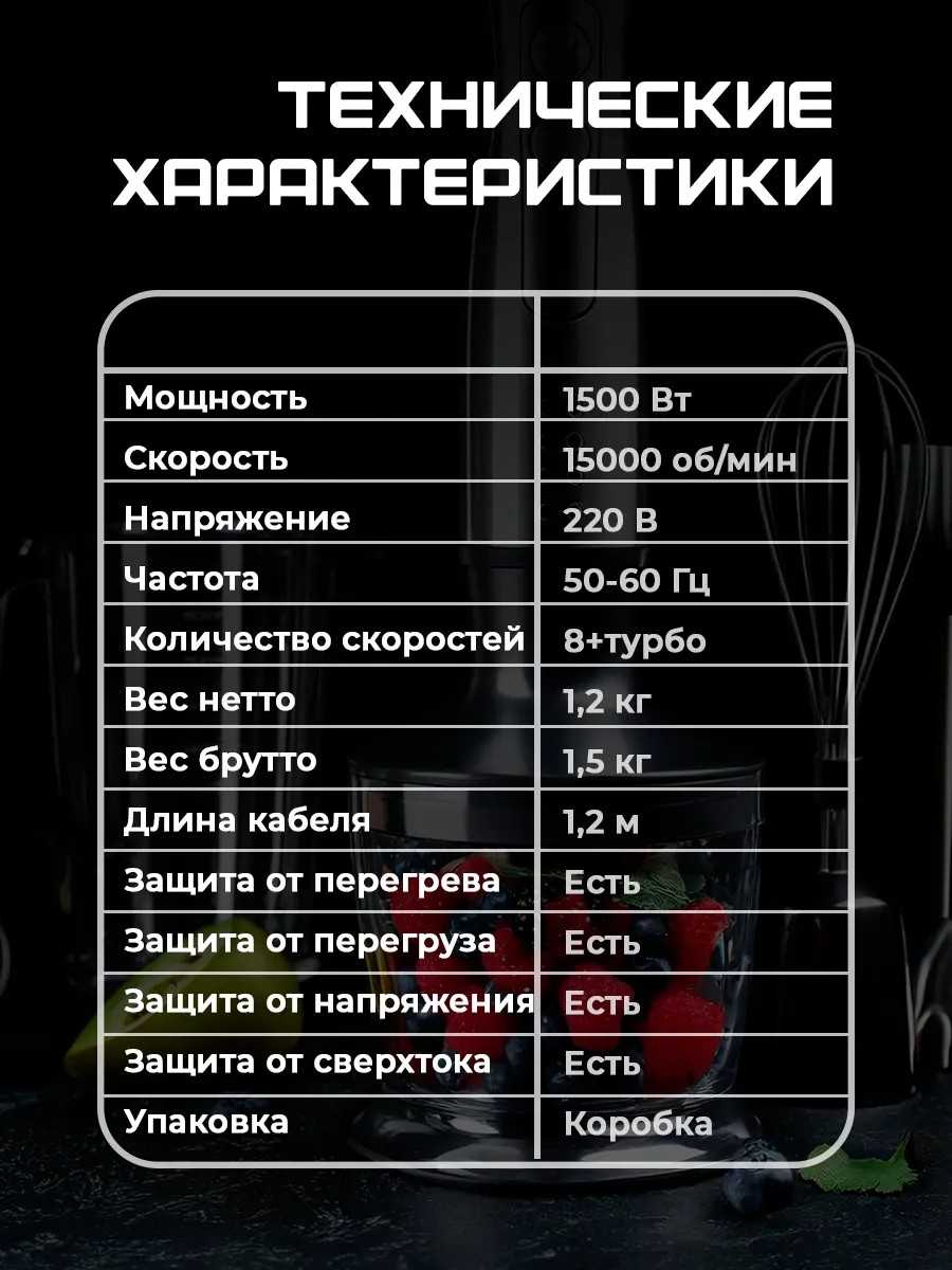 Дополнительные функции : | защита от перегрева, защита от перегрузки, колка льда, плавная регулировка скорости, пониженный уровень шума |