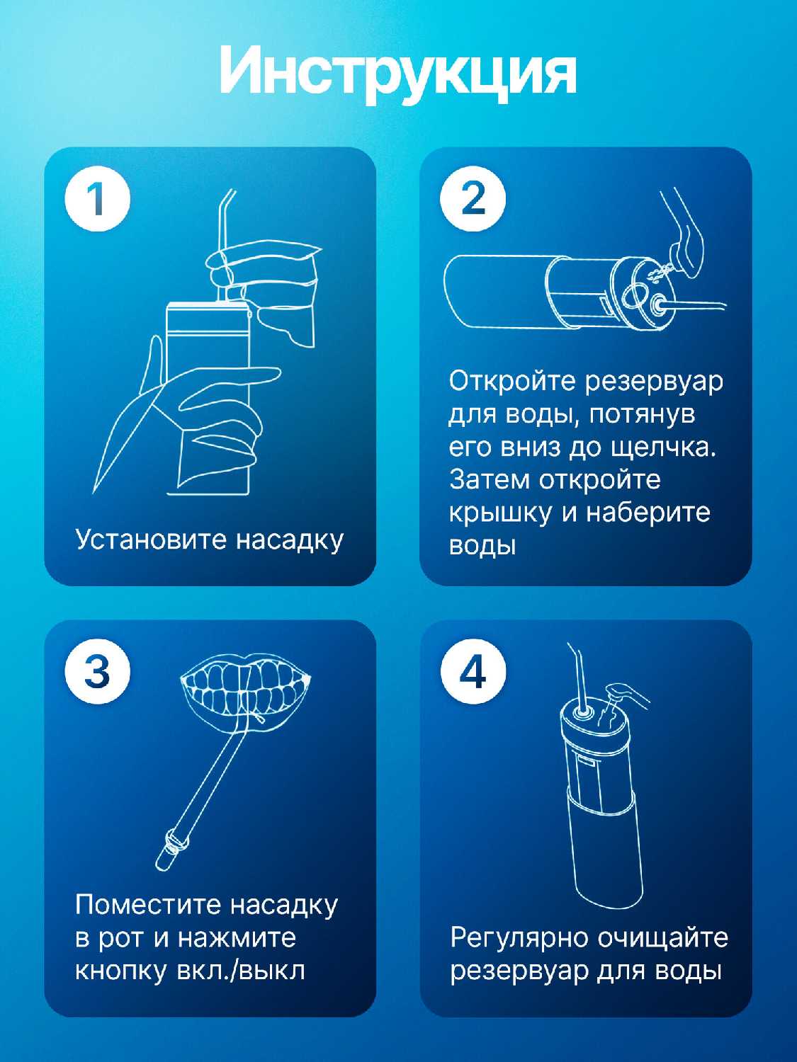 - - Резервуар для воды маловат, приходится раза 2-3 заполнять его, чтобы полноценно почистить рот