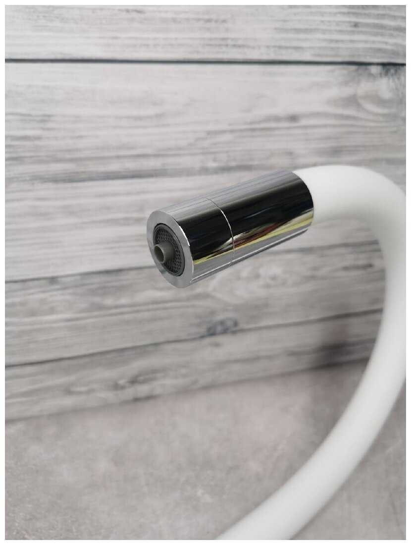 - + Красивый смеситель. Металлическое основание матовое как и шланг, смотрится гармонично. Мне пришёл полностью белый смеситель (сама гадала что же приедет), как и хотела. Классная фирменная упаковка, производитель вложил даже белые перчатки. Можно вмонтировать в столешницу толщиной до 4,5-5 см.