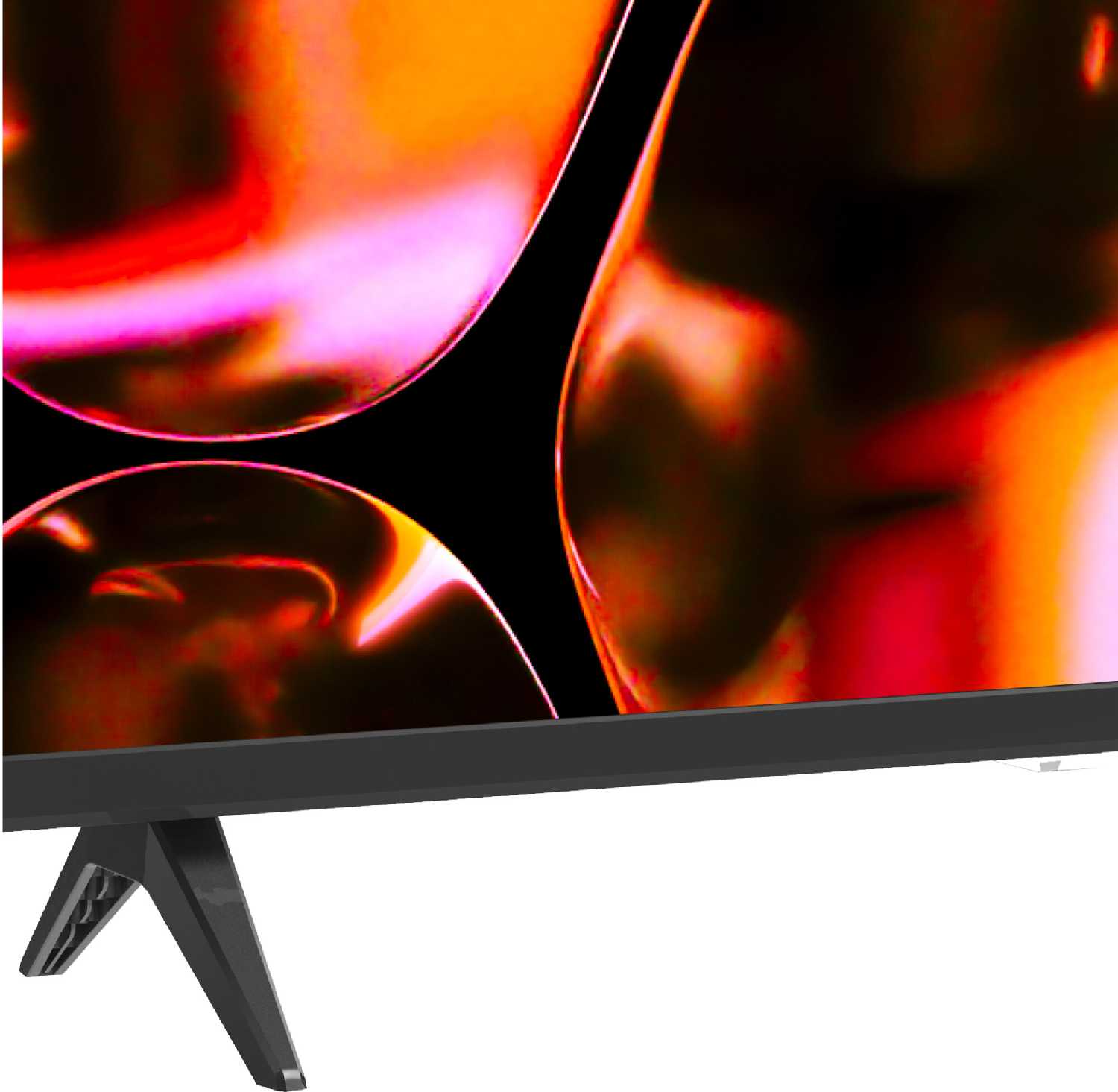 - Тонкие рамки вокруг экрана (безрамочный дизайн) и компактная центральная подставка, что позволяет органично вписать телевизор даже в ограниченное пространство на узкой тумбе или в нише.