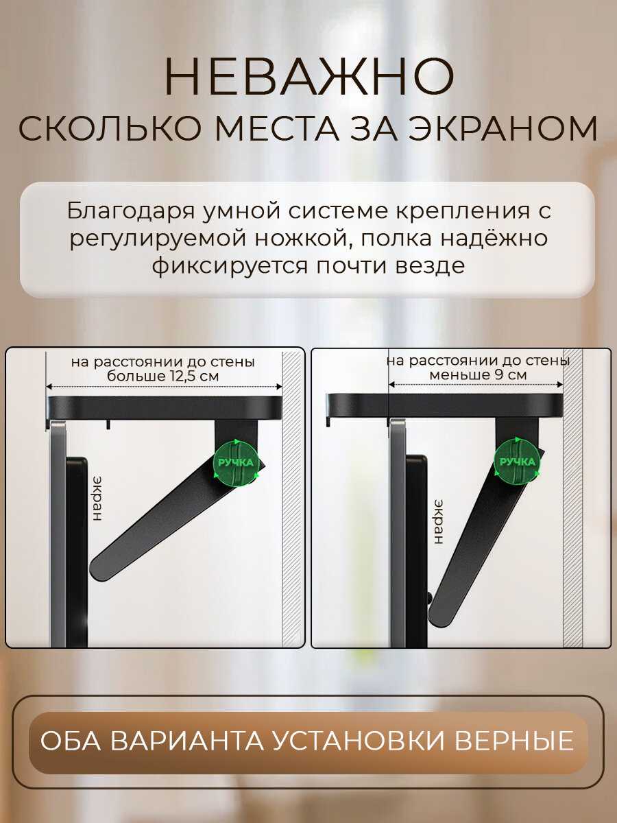 Полка крепится сверху на телевизор. Держится хорошо.