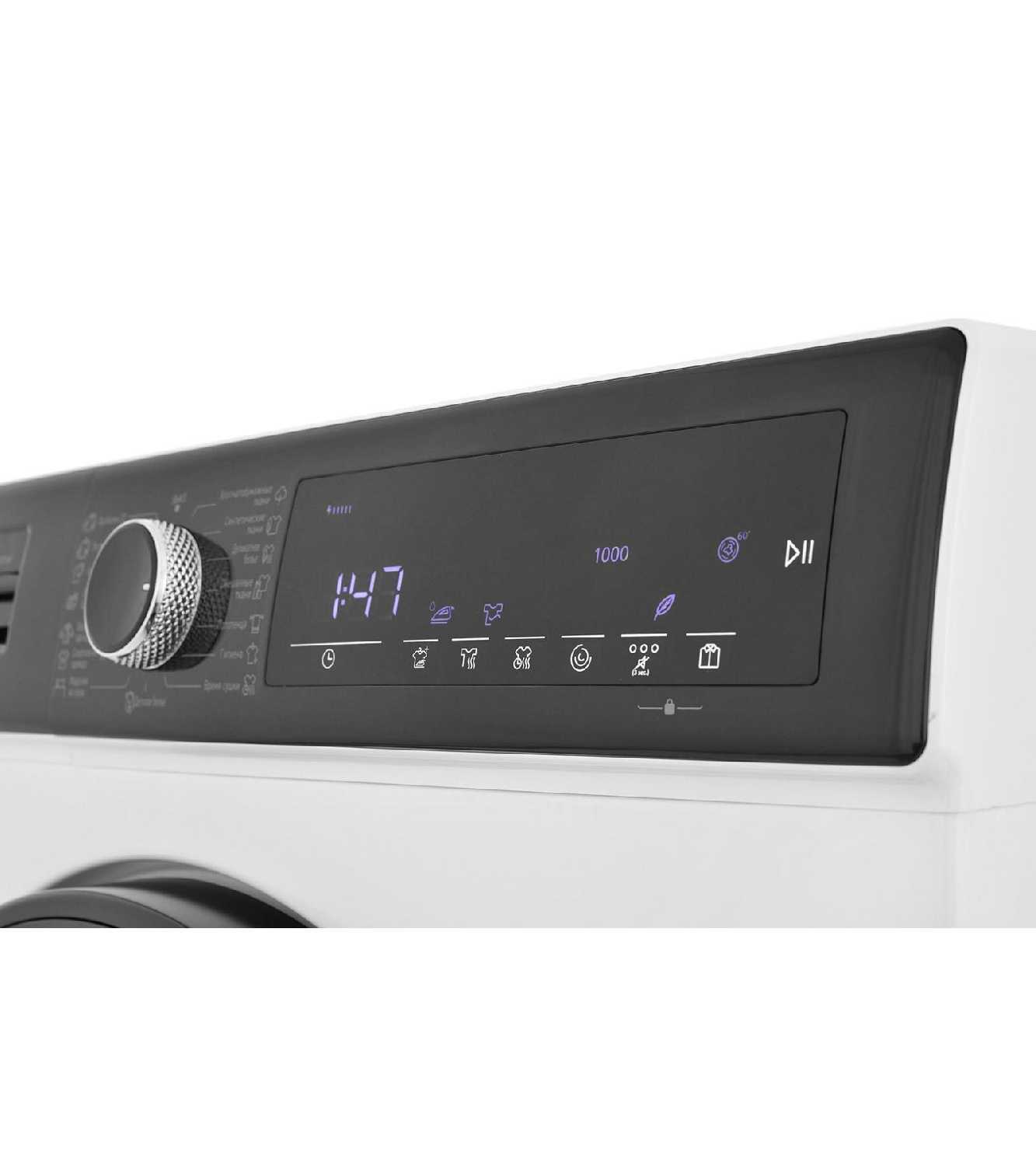 Управление простое и понятное. Есть подсветка, как для красоты, так и для удобства. Много разных режимов, в зависимости от типа ткани. Есть быстрая сушка, есть более длительные режимы, после которых можно сразу гладить вещи.