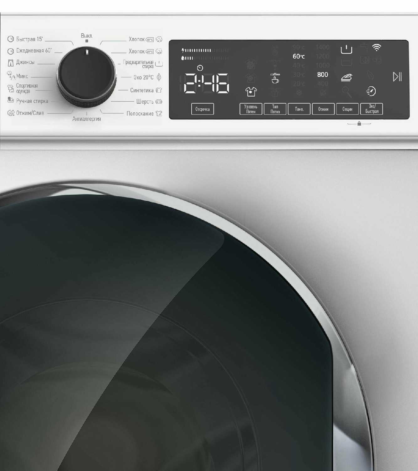 - Четкий русифицированный интерфейс с индикацией оставшегося времени стирки.
