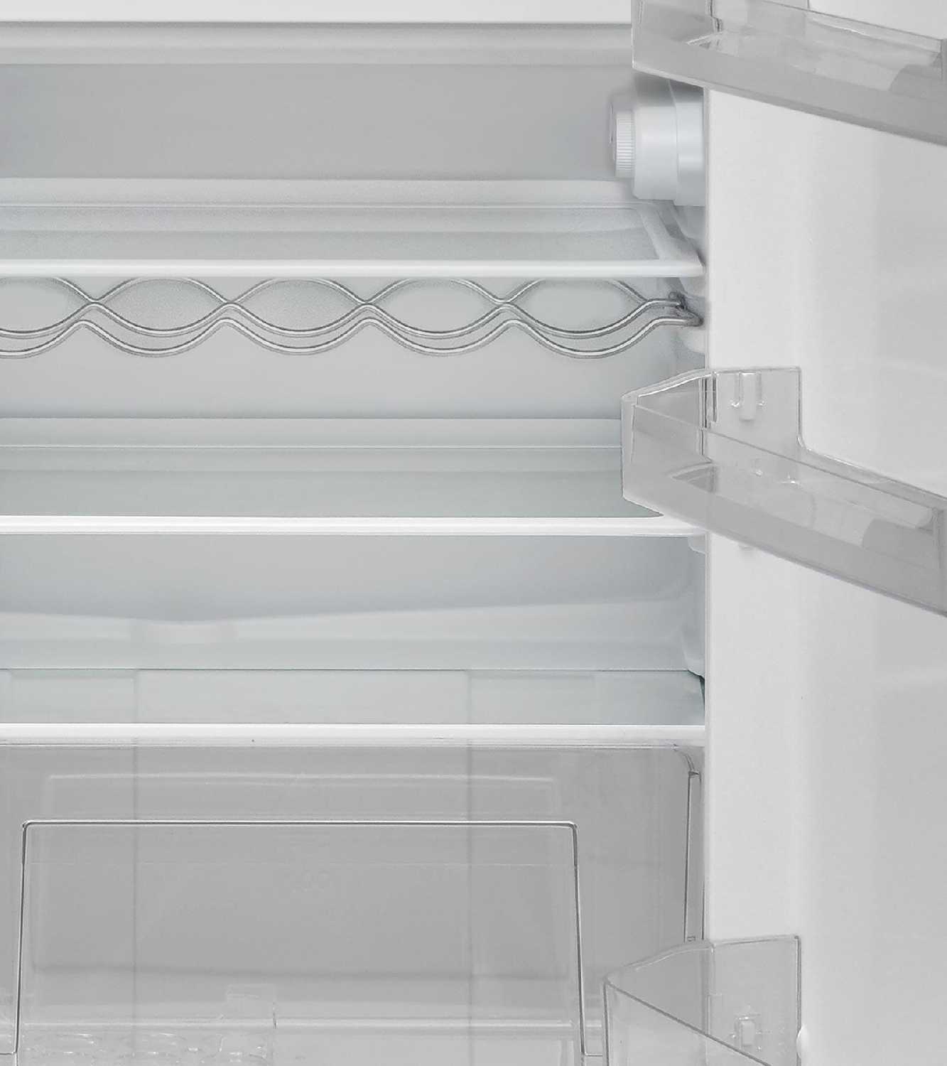 Холодильник оснащен стеклянными полками, высоту которых можно регулировать согласно потребностям пользователя. На дверце расположены вместительные полки стандартной ширины, позволяющие разместить бутылки с молоком, масло и другие продукты. Также имеется пластиковый ящик для овощей и фруктов, что редко встречается в моделях подобного размера. -