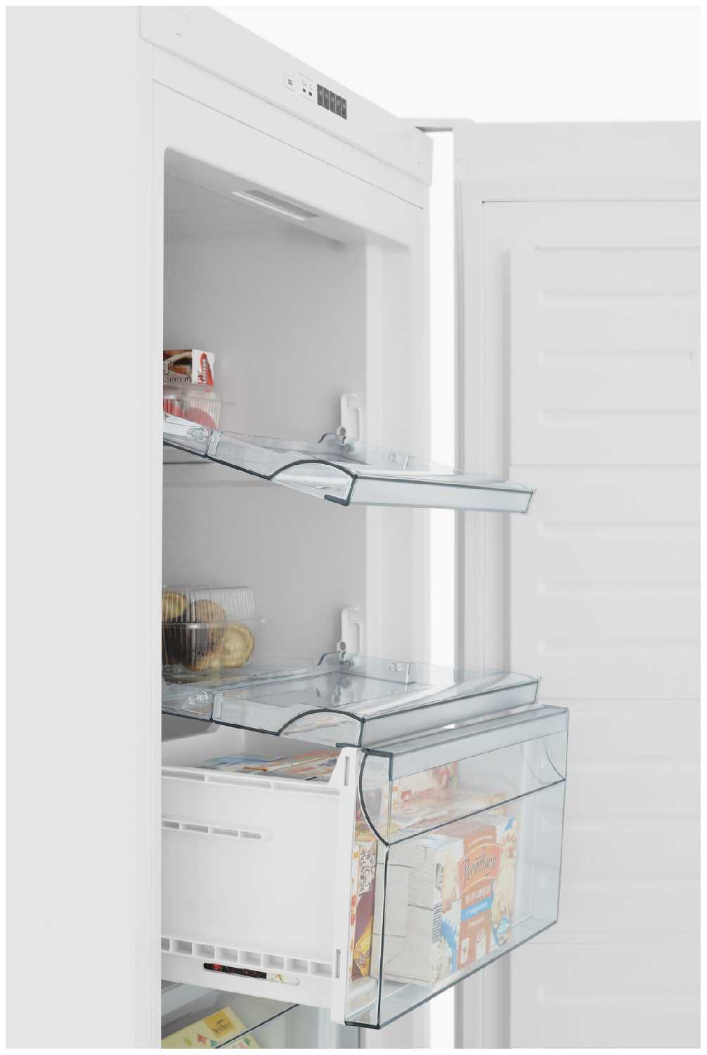 - Верхние отделения морозилки открываются, а не выдвигаются, что упрощает доступ к мелочам.