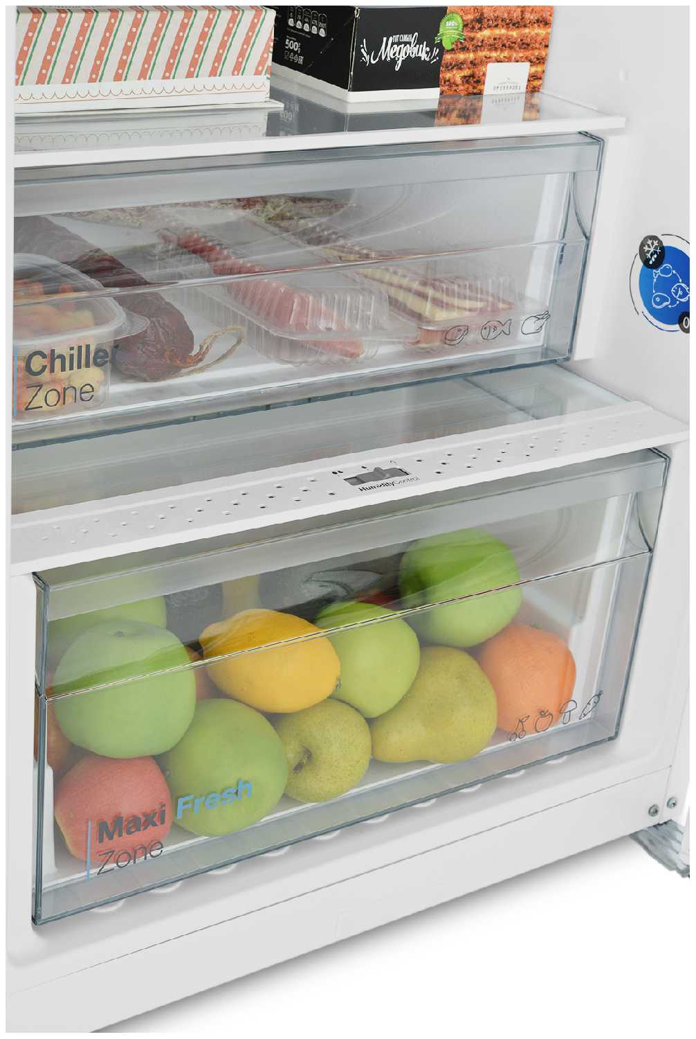 - Зона свежести с температурой около 0°C сохраняет продукты дольше, фрукты и овощи остаются свежими месяцами.
