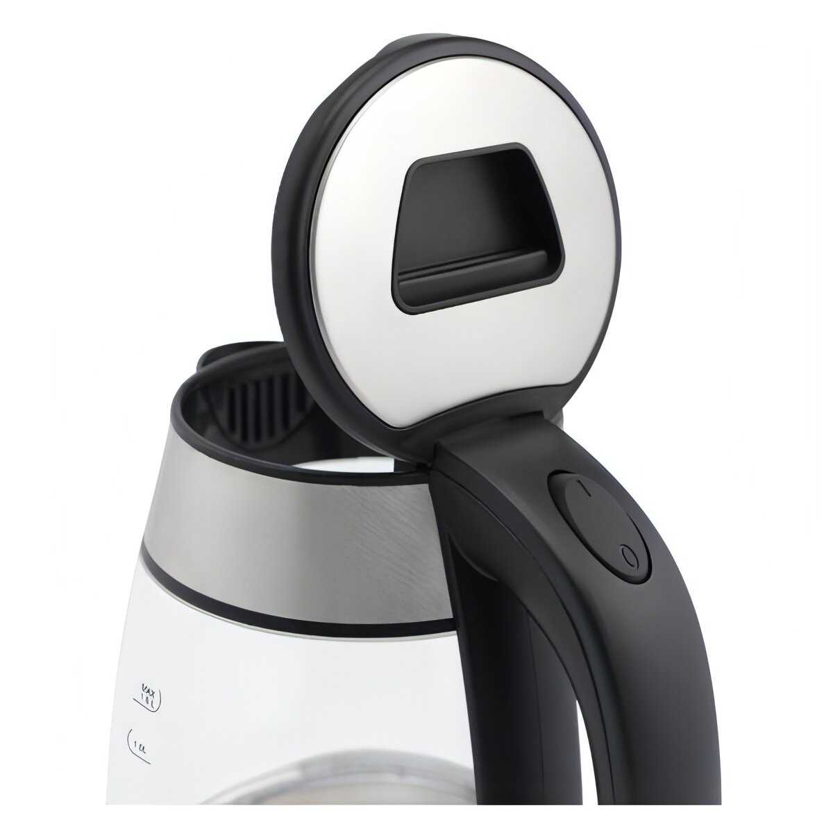 - Прозрачный стеклянный корпус (термостойкое боросиликатное стекло) позволяет контролировать уровень воды, чистоту колбы и отсутствие накипи без открытия крышки.