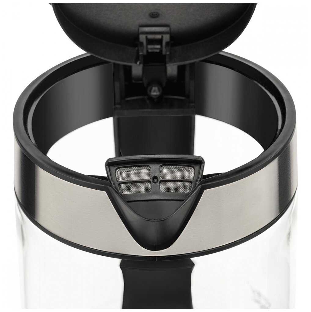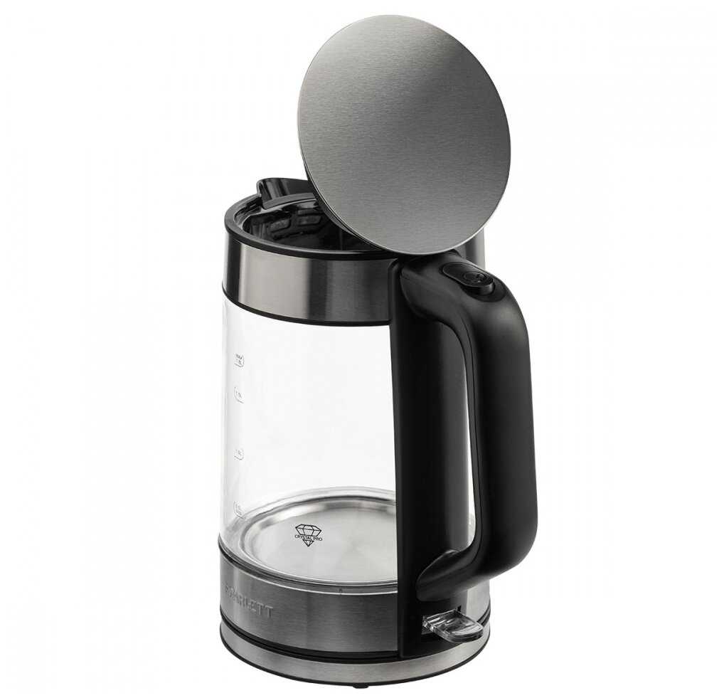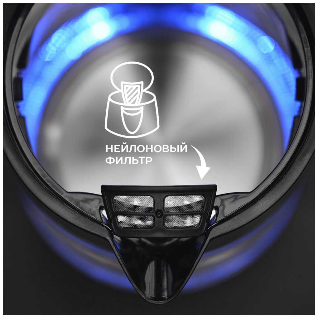 Данный электрический чайник представляет собой удачный компромисс между эстетикой и базовой функциональностью. Его ключевое преимущество — сочетание прозрачного стеклянного корпуса с металлическими элементами, что обеспечивает визуальный контроль за процессом кипячения и долговечность. Мощность 2200 Вт позволяет быстро нагревать воду: полный объем закипает за 5 минут, что на 15–20% быстрее аналогов в этом ценовом сегменте. Особенно удобна LED-подсветка, которая не только добавляет современности дизайну, но и помогает использовать чайник в условиях слабого освещения.
