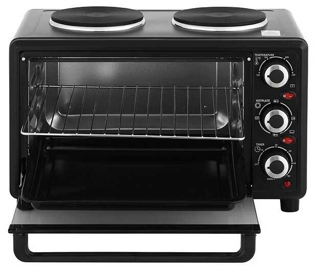 - + Занимает мало места,быстро нагревается,хорошо печёт. Есть регулятор температуры.