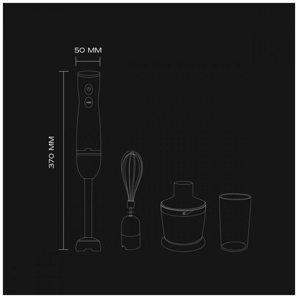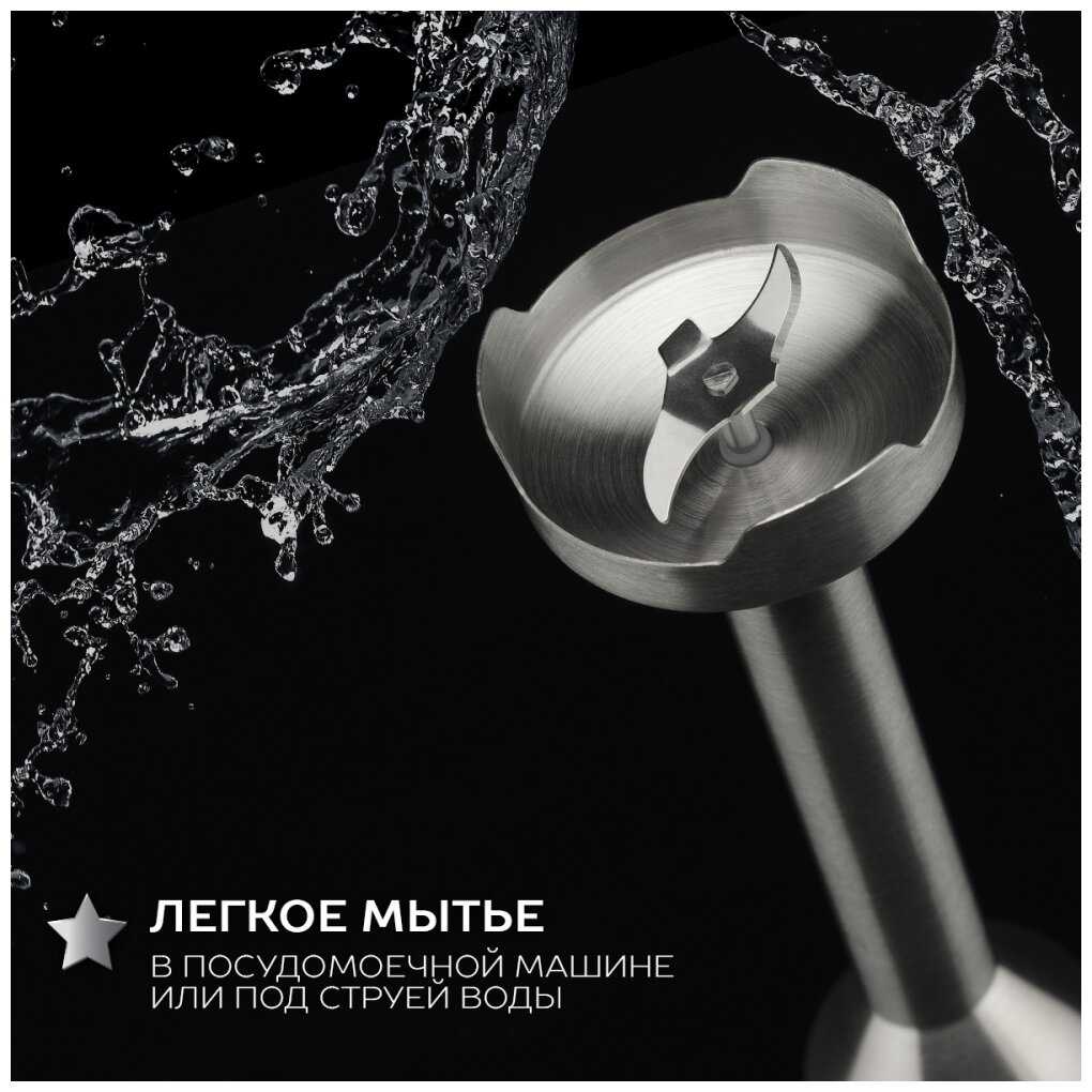 - Погружная часть из нержавеющей стали выдерживает контакт с горячими супами (до 100°C), что упрощает приготовление пюре прямо в кастрюле.