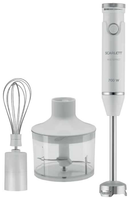- Включает погружной нож, венчик для взбивания и измельчитель, что позволяет готовить пюре, соусы, фарш и кремы без дополнительных покупок.