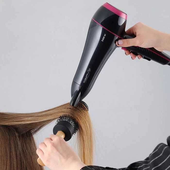 - Две скорости потока воздуха (например, 80 км/ч на максимуме) дают контроль над объемом и текстурой прически.