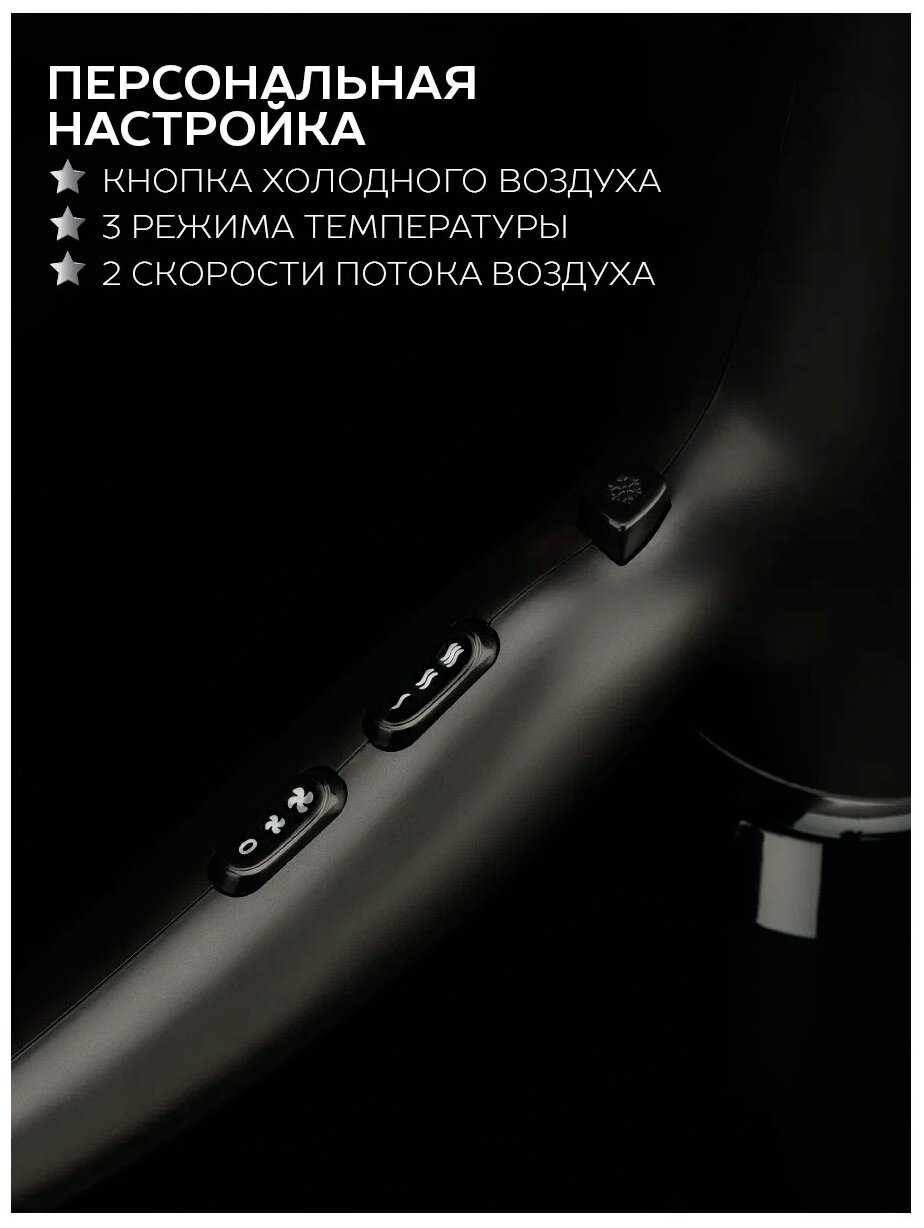 - Три режима нагрева (холодный, теплый, горячий) и две скорости воздушного потока обеспечивают гибкость в выборе оптимального режима.