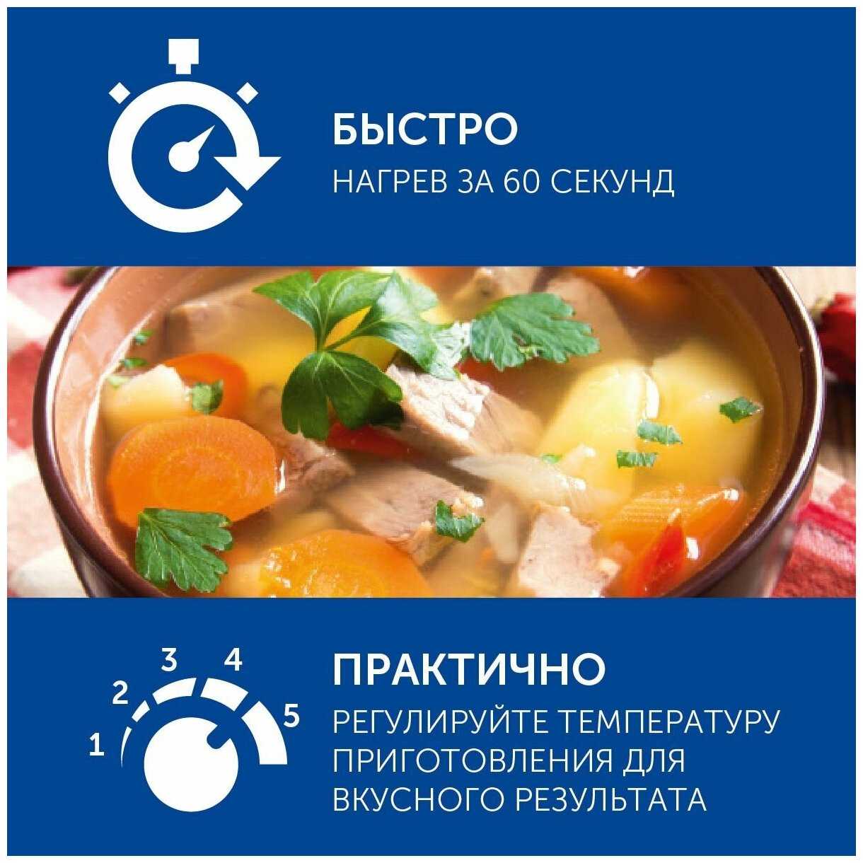 - Импульсный нагрев поддерживает заданную температуру, предотвращая перегрев посуды.