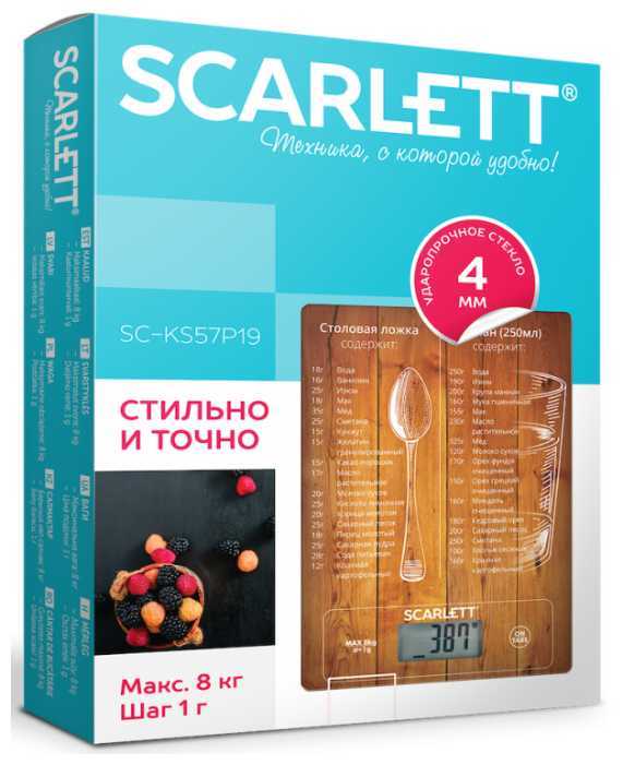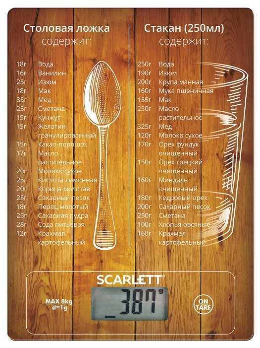 Выбирали недорогие точные весы, остановили выбор на кухонных весах от фирмы SCARLETT. Стильный внешний вид, лёгкие в использовании, понравилась функция вычета веса посуды, не надо самой счетать. Удобная памятка на дисплей с граммовкой продукта в ст.ложке и в стакане(250мл).