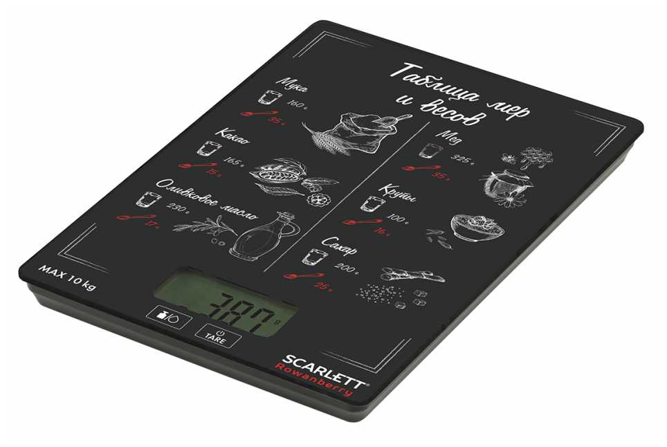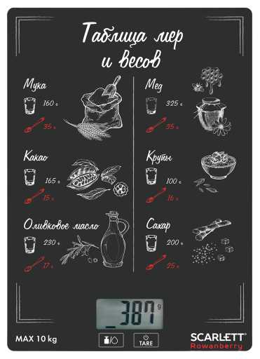 - Весы имеют стильный вид с информативной таблицей мер и весов на платформе, которая служит подсказкой при готовке и висит на стене как декор, упрощая использование для рецептов.