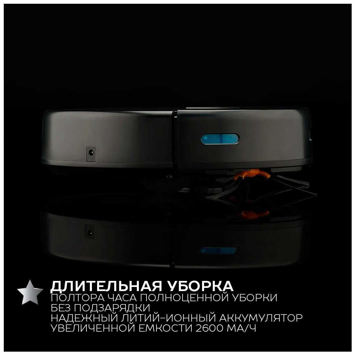 Сравнительно большая ёмкость для мусора. Управление по WI-FI (планирование заданий). Несколько режимов уборки в приложении. Заряда батареи хватает до двух часов уборки. Радует цена.