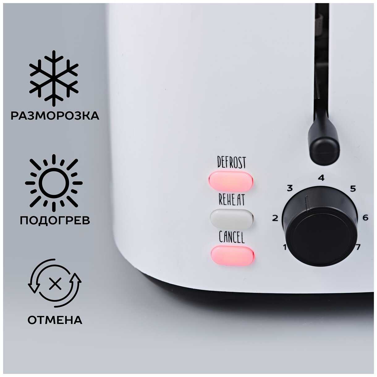 Функция разморозки эффективно готовит замороженный хлеб к обжарке без предварительного оттаивания, что особенно ценится теми, кто запасает тостовый хлеб впрок. Режим подогрева позволяет освежить уже готовые, но остывшие тосты без дополнительной прожарки — это исключает пересушивание и сохраняет текстуру. -