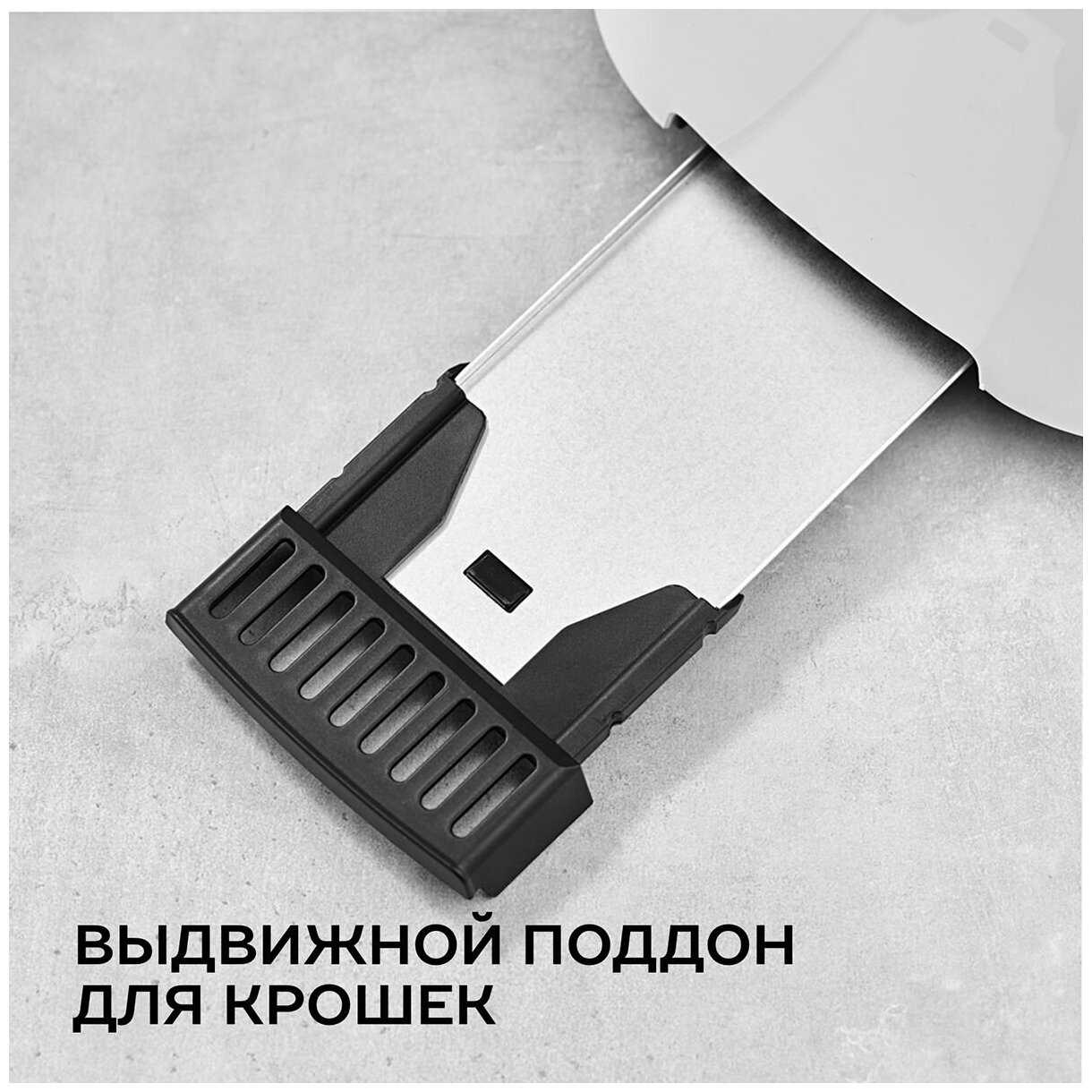 Съемный поддон для крошек легко вынимается одной рукой и предотвращает загрязнение стола. Пользователи подчеркивают, что крошки не пригорают к решетке, а пластиковый корпус устойчив к пожелтению и не требует специальных средств для очистки. -