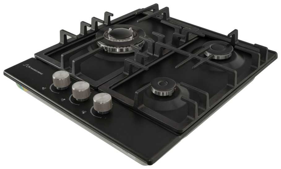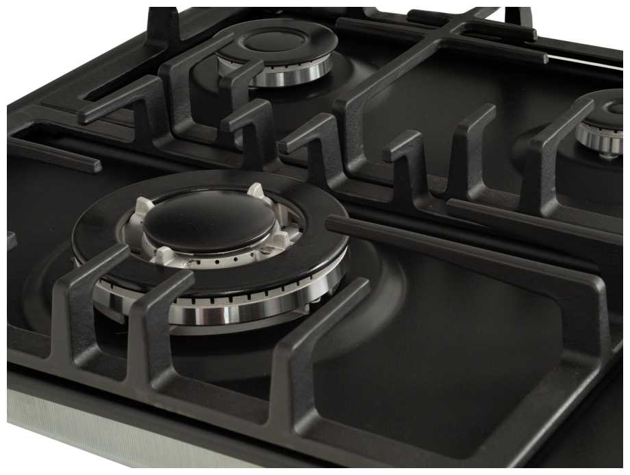 - Треугольное расположение конфорок (включая мощную WOK-зону) позволяет одновременно размещать крупную посуду без тесноты.