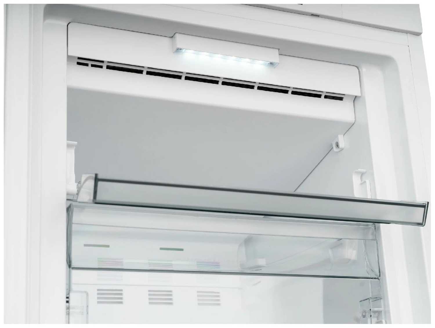 Освещение есть внутри всей камеры, удобно для поиска продуктов. Нет звукового сигнала открытой двери — только светодиод мигает. Это упущение по отзывам, приходится следить визуально. -