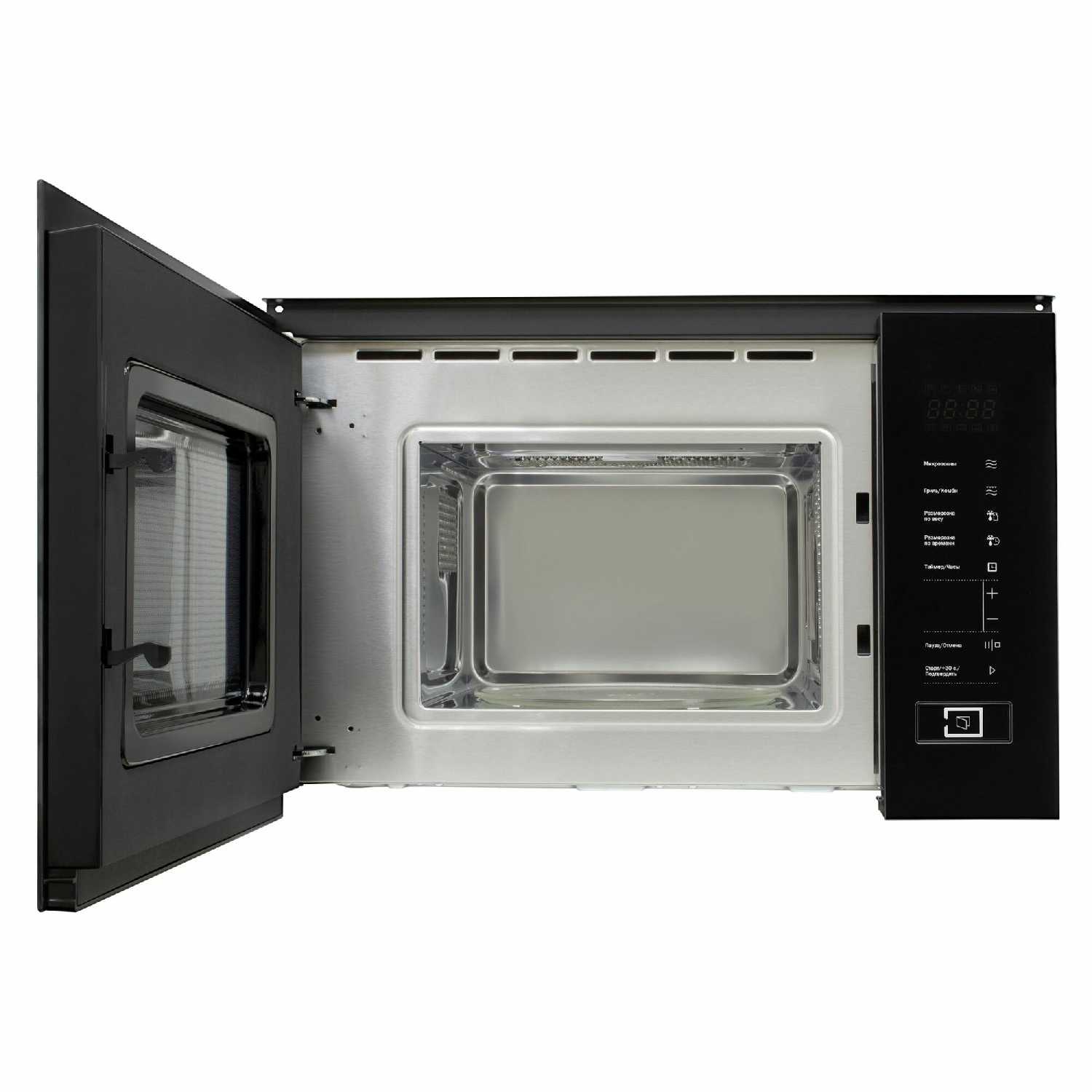 - + Микроволновка компактная по глубине, так что встраивается без проблем — у меня встала ровно к стене, а фасад получился заподлицо. Нагревает еду равномерно и быстро. С режимами разобраться получилось моментально, они почти такие же, как в старой модели, ничего сложного.