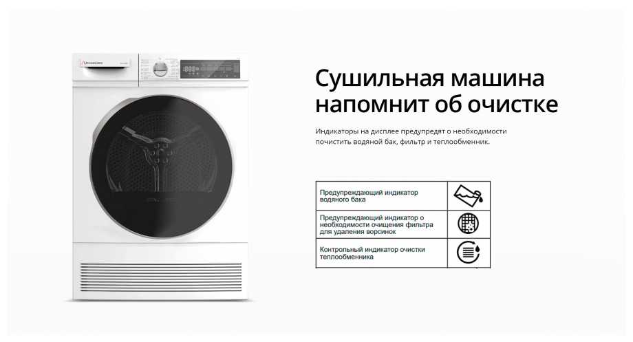 - Датчики автоматически определяют остаточную влажность, корректируя время сушки.